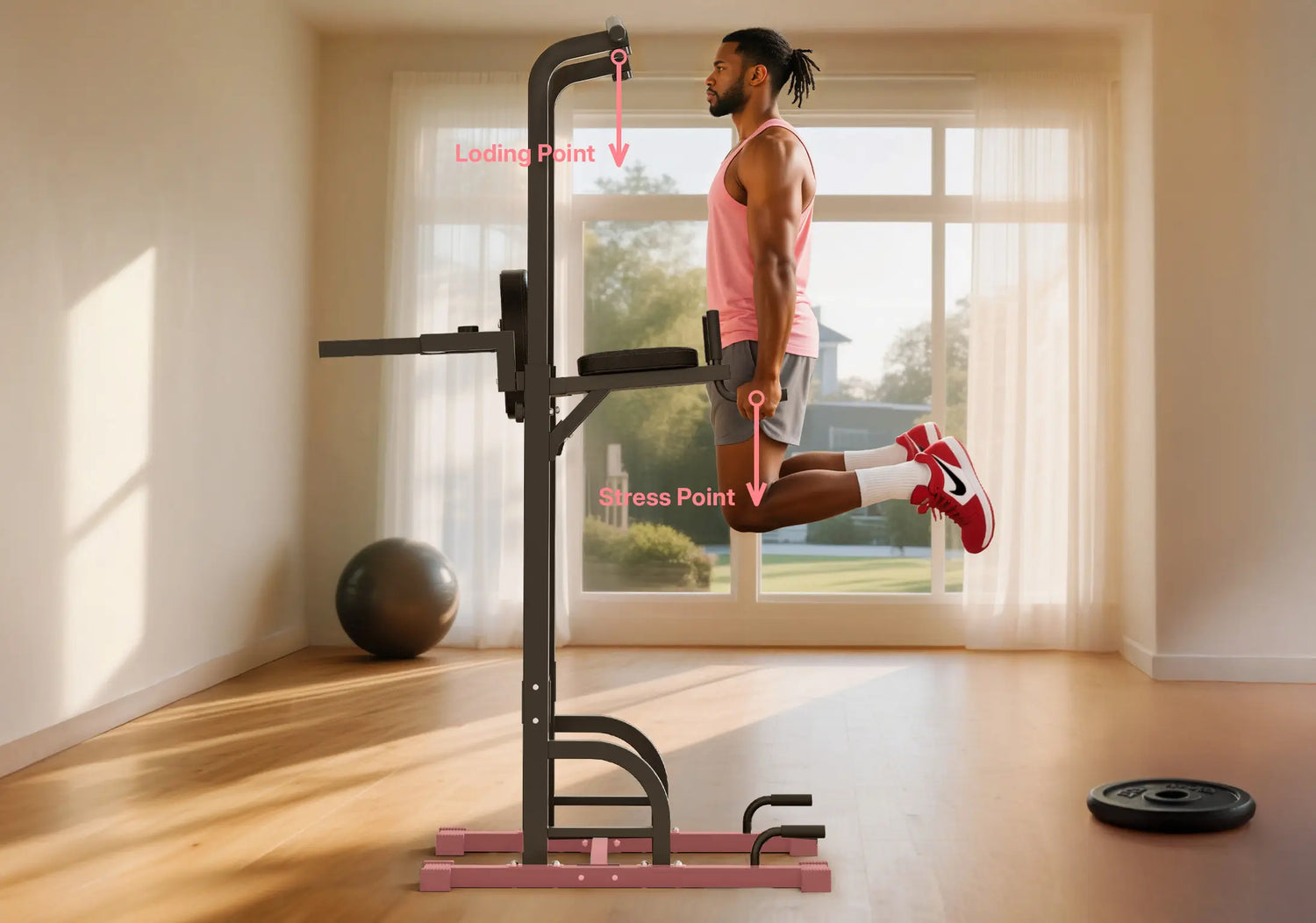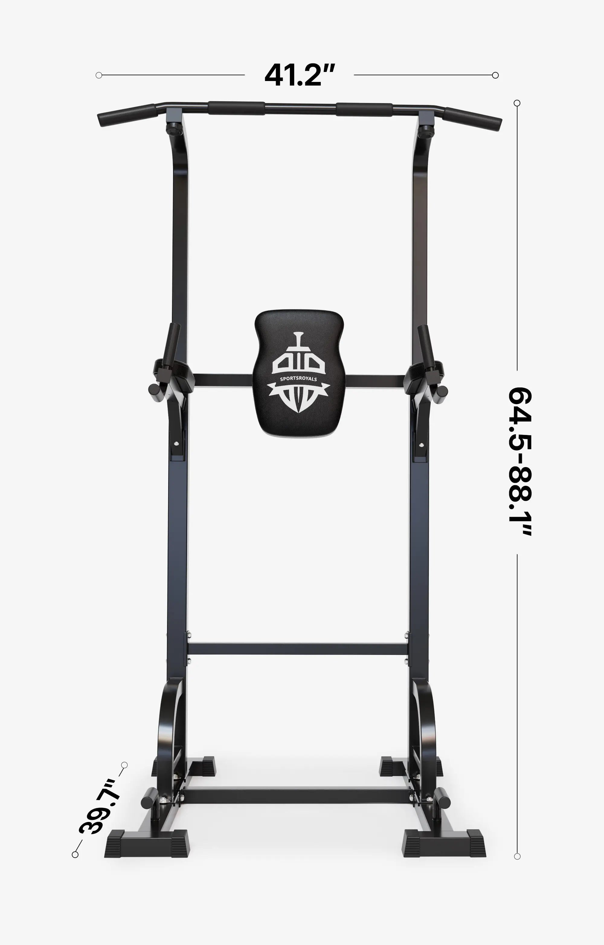 Long-size base has more loading points, which makes the power tower more stable. Featuring 5mm thick steel pipe, this pull-up and dip workout station is sturdy and able to hold 450lbs of weight.