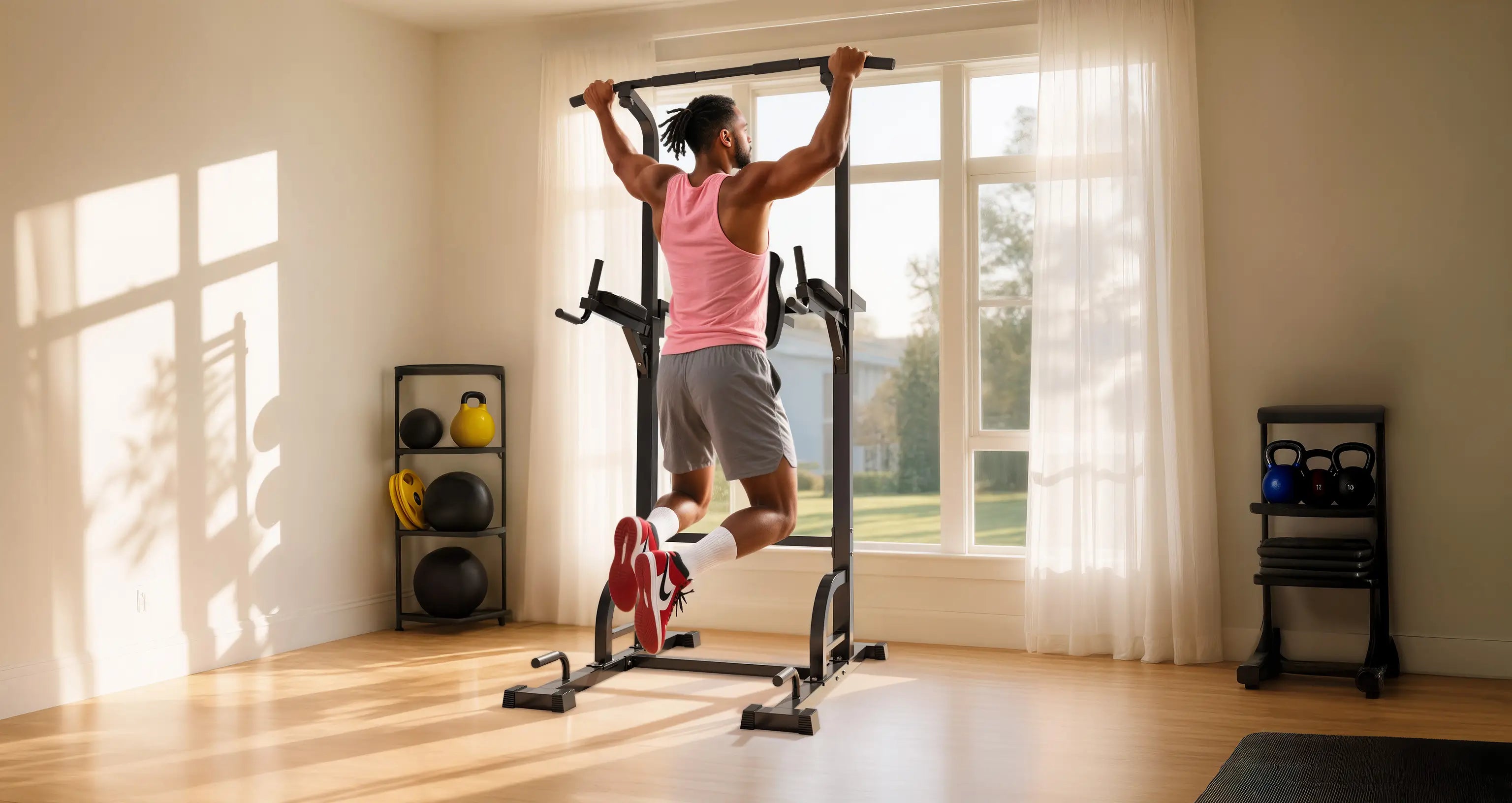 The backrest distance and pull-up bar height can be easily adjusted with a knob for effortless switching to your desired settings.
